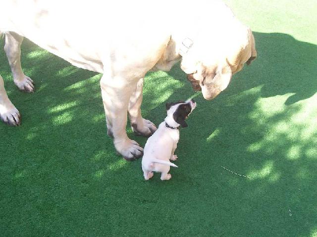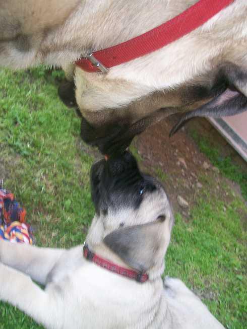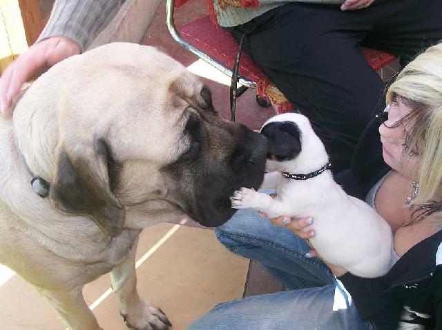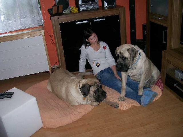 O plemeni:Anglický mastif je opravdový obr s velkým srdcem.Bezmezně miluje svoji rodinu a její blízké přátele bere navědomí jakoby k rodině patřili.Je nutné,aby způsob chovu byl minimálně kombinovaný,protože mastif vyžaduje úzký kontakt se svojí rodinou a pobyt v kleci bez svého pána je pro něho trestem.Naše ,,holčičky,,pokud není nikdo doma,nepustí za vrátka ani myšku,tedy pokud ji neznají.On by se tam ani nikdo neodvážil.Jakmile ale budeme doma,může k nám vejít prakticky kdokoli.Stačí jen ,,holčičky,,poučit,že je vše v pořádku,že to je hodná návštěva a po chvíli se nechají hladit.Doslovně platí že je to něžný obr,který miluje své nejbližší,ale je schopen je bránit.
