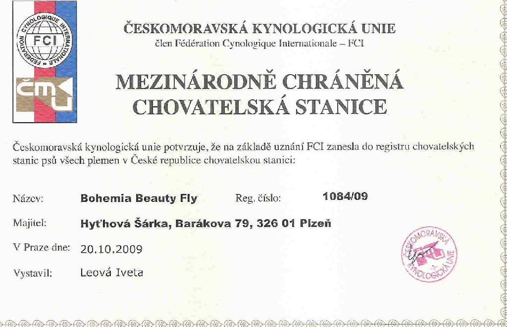 Adresa: Plzeň Telefon: 607616918 Zodpovědná osoba: Šárka Hyťhová www: www.beautyfly.cz Mail: | Reg. číslo CHS: 1084/09 Certifikát CHS: Zobrazit Certifikát ::: Plánujeme vrh: 01.01.2012 Hodnocení: 86 bodů ze 100 |