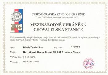 O nás:Vznik chovatelské stanici Black Tenderline je v roce 2008. Zatím jsme malá chovatelská stanice, s jednou chovnou fenou. Máme velké plány do budoucna. Psy v naší ch.s jsou a vždy budou testovaný na dědičné onemocnění CEA/CH, CL a TNS. Mají vyšetření DKK, PRA/CEA,C,LL,KAT. Věnujeme se výstavám a psím sportům. Naším cílem je odchovat nepříbuzný vrh, s exteriérním psem jako naše fena. Krycí pes musí mít udělané genetické testy. Naše chovatelská stanice jak už jsem se zmínila má zatím jednu chovnou fenu, která má výstavní ocenění: VN 1, Euro dog show 2008 Výborná, CAJC, res. CAC, res. CACIB A výsledek z tance se psem 3x 2. místo jedno z toho na světové výstavě 2009!!. MÁME ŠTĚŇÁTKA!! Vrh A narozen: 16.5.2010!! Štěňata budou po rodičích DNA CL,TNS NORMAL. Bereme záznamy. Více se dozvíte na naších webových stránkách.