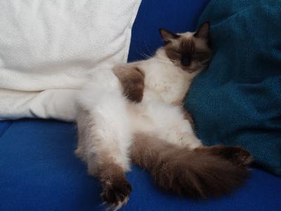 O plemeni:Ragdoll je velká a těžká kočka,proslulá zejména svou klidnou povahou.Má polodlouhou srst jemné struktury.Barvy a odznaky se vyvíjejí pomalu často 2-4 roky.Jsou dobře osvalené a hmotností předstihují ostatní plemena koček,ale je to plemeno velmi dobromyslné.Snadno se vycvičí pomocí odměny,může i aportovat.Nejkrásnější na ragdollovi jsou jeho překrásné modré oči.