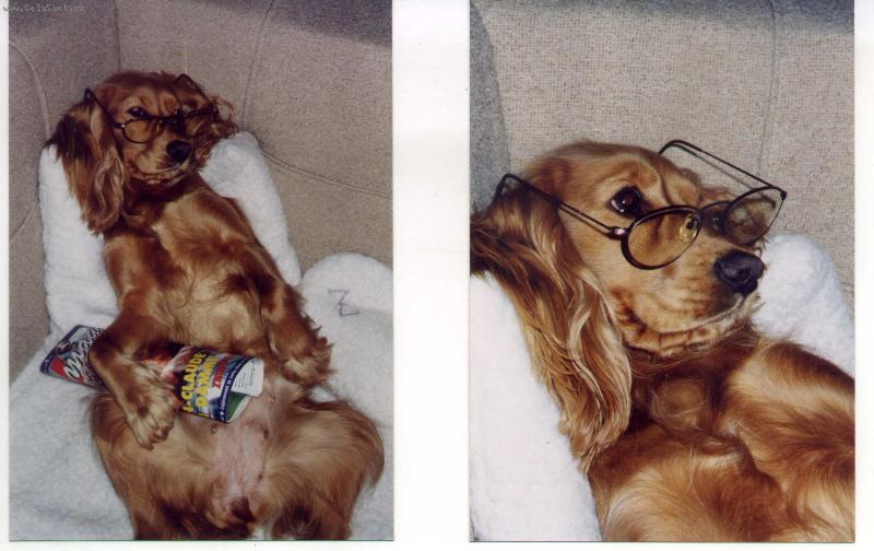 dvě foto kokrpaniela s brýlemi a časopisem